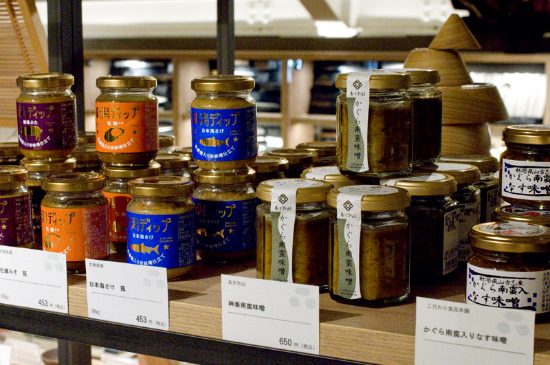 Niigata produces more than just sake and beer of course, and the shop sells a range of unusual regional delicacies, from Sado Island's Le Lectier pear jam to heirloom-breed pork sausages, pickles and miso paste. There's a surprising variety of salmon products to explore, and you can bring home a package of Niigata's famous Sasa Dango - sweet bean-paste and mugwort dumplings wrapped in bamboo grass.