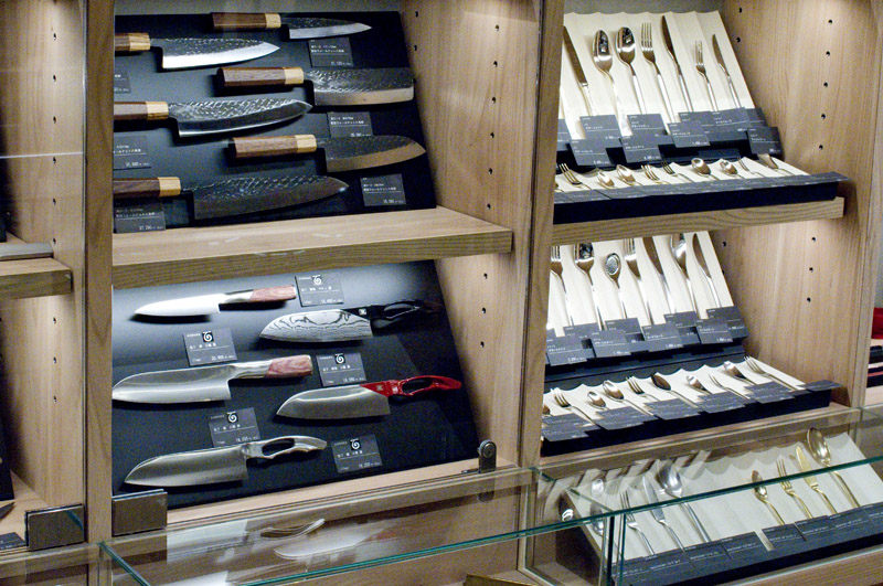 The rest of Niigata 100 (it's pronounced "ichi-maru-maru") is filled with beautifully crafted glassware and ceramics, specialized chef's knives, metal kitchen utensils and more. Detailed biographies of the local Niigata craftsmen who make the products can be found alongside their work.