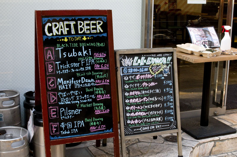 La La Chai serves Thai food and craft beer, with a half-dozen taps dispensing beers from breweries like Y Market (Nagoya), Black Tide (Miyagi-ken) and Yatsugatake (Nagano). The food menu features lots of grilled meats and a number of southern Thai dishes like pork-rib curry, Phuket pork belly stew, and southern Thai rice salad.