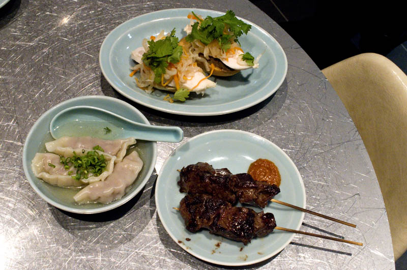 Popular dishes include shrimp wontons, lamb sui-gyoza and other dumplings; mini banh mi pinchos; and a variety of skewered grilled meats. Shrimp-squid fritters served with a garlicky aioli were a standout, as were the skewers of grilled beef skirt steak. Assorted stir-fries, spicy Thai-style salads and various noodle and rice dishes round out the menu.