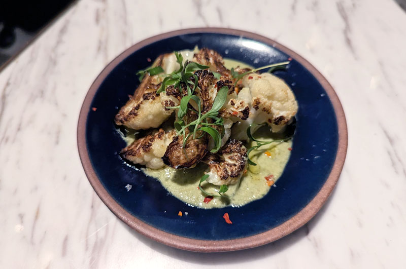 Dam's menu features ambitious snacks like snapper ceviche and taramosalata as well as oven-grilled seafood (shrimp, squid, soft-shell crab), sausages, and vegetables (asparagus, cauliflower, jumbo mushrooms with cheese). Our soft-shell crab was ample in size and perfectly prepared and seasoned, and our oven-grilled cauliflower was nicely complemented by fresh herbs and a tangy green-curry sauce.