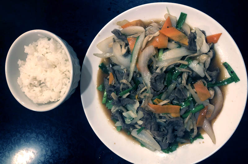 Another favorite for the cognoscenti is the Samgyeopsal stir-fry. Grilled pork-belly is stir-fried with carrots and onions in a sweet-and-spicy chili sauce and garnished with sesame seeds. Anyone who orders it is forced to get a refill of rice to mop up the sauce.