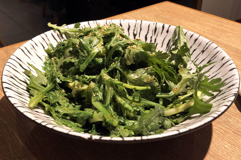 While billed as a soba restaurant, there is a great choice of seasonal dishes and recommendations before the mains. On a recent visit, we had a great time trying the side dishes. Our host recommended the shungiku salad with sesame oil and it was quite a performance. A large bowl of chrysanthemum greens is brought over inside an even larger plastic bowl before being liberally drenched with fragrant steaming sesame oil. It sizzles and spits, hence the protective bowl. Surprisingly, it wasn't an overpowering or oily dressing when mixed with the pungent greens.