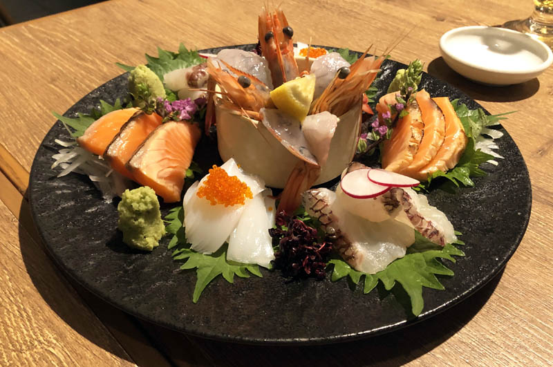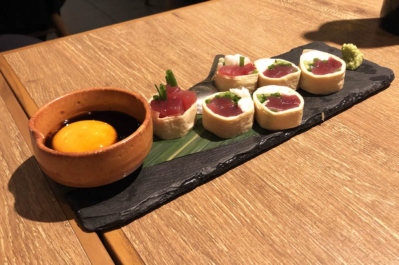 The deep-fried burdock roots are crunchy and sweet, accompanied with curry powder and mentaiko-mayo dip. The grilled anago (saltwater eel) is served with the backbone deep-fried too, a delightful crispy snack. The sashimi platter is really well presented and featured sweet shrimp, tender squid, fatty salmon and sea bream. Another surprise was the tuna sushi roll: fatty tuna rolled with mountain yam and wrapped in yuba (tofu skin). The dip was soy sauce and raw egg yolk, a rich and unusual choice.