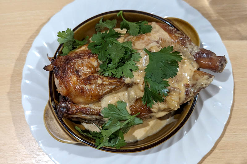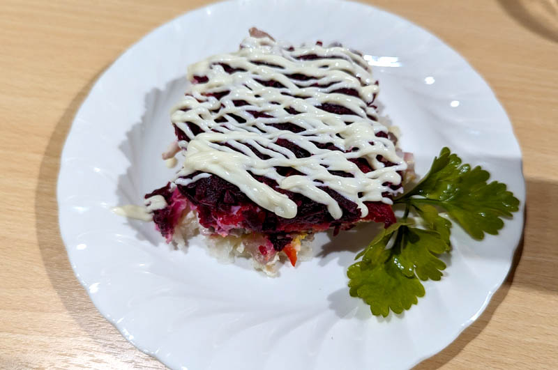 The poetically named Herring in a Fur Coat is an appetizing starter - the natural fishiness of the herring is well balanced by the rich sweetness of grated beets. Georgian-style eggplant rolls stuffed with walnut paste are pleasantly salty, with the unusual walnut flavor providing an extra kick. And the Georgian Shkmeruli - a hefty portion of stewed chicken swimming in garlicky cream sauce - is simply magnificent. A side order of bread to help soak up the sauce is recommended.