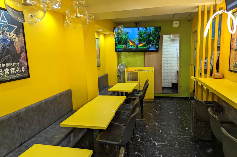 There's also a blackened version of the fried chicken that's colored with squid ink, in case you're throwing a themed party of some kind. If you don't want a whole bird, chicken is available by the half-bird, by the piece, or in the form of chicken burgers. Side dishes include "super cheese balls", which have a chewy mochi-like texture, and miniature spicy red sausages. Drinks include various flavors of tapioca milk tea and other soft drinks.