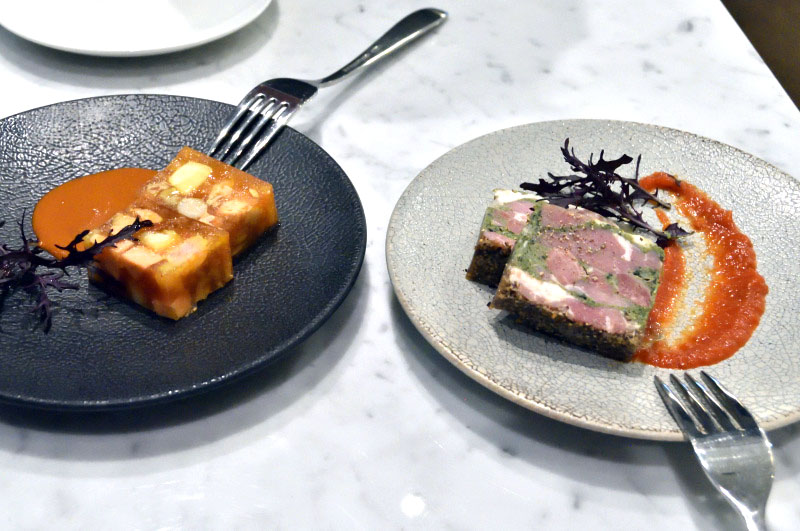 The Salmon Vegetable Terrine is lighter but still rich, livened up by a fresh-tasting horseradish sauce. Pork Tongue and Spinach Pate is satisfyingly meaty, and the Oyster and Scallop Terrine, served warm, is full of deep flavors that will perk up the appetite.