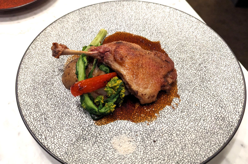 Main dishes range from roast Hokkaido venison and roast pork shoulder to herb-crusted lamb chops, wagyu beef cheeks braised in red wine, and duck frikadelle (meatballs). Lien's duck confit is skillfully prepared, with crackling crisp skin and succulent meat that falls off the bone.
