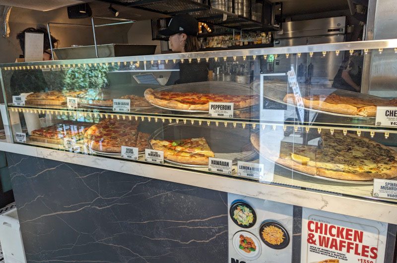 Pizzas start at around Y550 per slice, and two slices are probably big enough for a meal.
