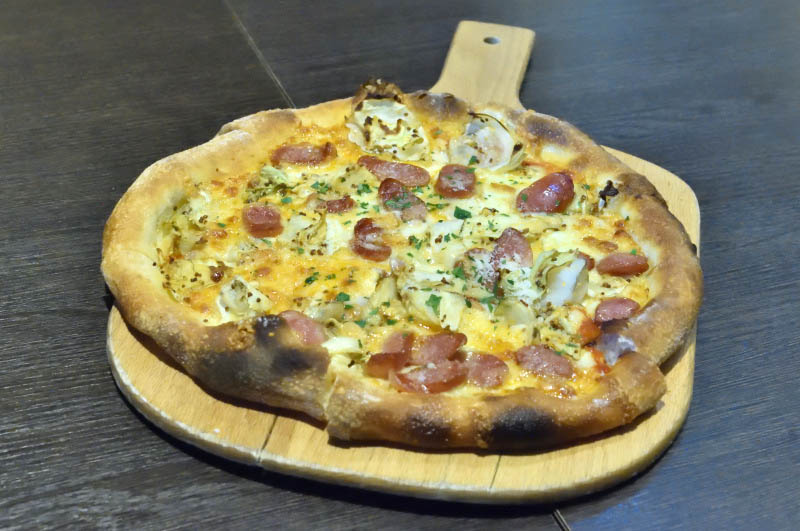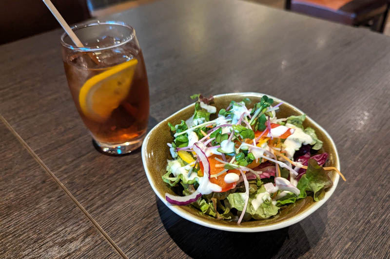 There are eight pizza varieties to choose from in the evening, with a more limited (and less fancy) selection at lunchtime. They do prepare a special lunch pizza every day though, and we enjoyed a nicely balanced topping of bacon, sausage and cabbage when we visited. The crust was on the crunchy side, holding its shape firmly when folded. The lunch special comes with a substantial salad, plus your choice of beverage for an extra Y200.