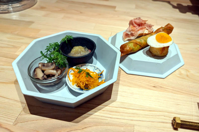 The small "mini-course" menu (Y2,500) is a good introduction - it starts with an unexpectedly fancy six-part appetizer spread followed by ramen noodles and dessert. Among the appetizer highlights during a recent visit were a mini Croque Madame served on a soft brioche roll, and a fantastic carpaccio complemented by an herb-infused jelly.