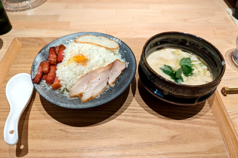 We were advised to leave a portion of the dipping sauce for the next course. This was a do-it-yourself risotto made by adding rice to the remaining dipping sauce and stirring in lots of additional cheese and a spicy yuzu condiment. It might be hard going back to ordinary ramen after this magnificent bowl.