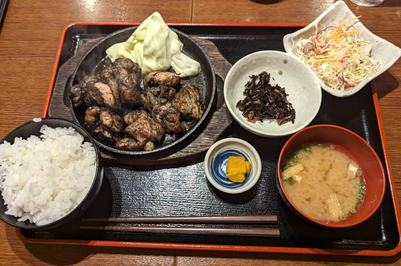 The lunchtime momoyaki teishoku features a hefty 200g of chicken, served on an iron skillet and still sizzling loudly when it arrives at your table. The chicken is surprisingly tender, with an intense smoky and garlicky flavor that's complemented by spicy yuzu kosho.