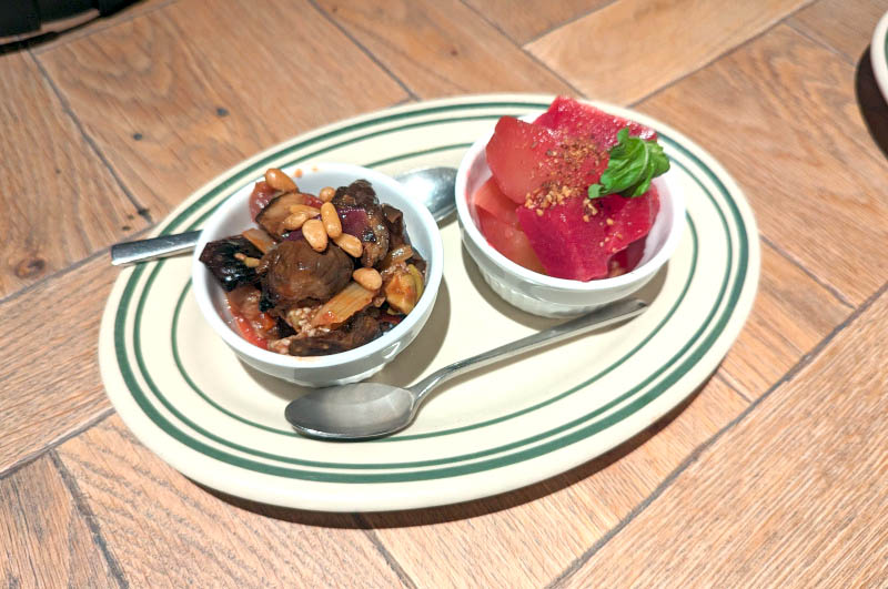 The multi-part "deli platter" makes an invigorating start to a meal. It's an assortment of four cold vegetable-centered delicacies like eggplant caponata, marinated beets, cole slaw with pecorino romano cheese and nuts, and marinated chickpeas and dried tomatoes - all with fresh Mediterranean flavors designed to perk up the appetite.