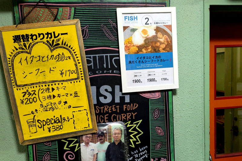 The dining room seats around two dozen - relatively large by the standards of Tokyo curry shops - with a handful of chairs in front of the shop to accommodate waiting customers. The restaurant's full name is "Fish Curry Shop Made by Three Uncles." It was a popular lunchtime destination in Ark Hills for some thirty years before closing; the current Shinjuku incarnation opened in 2018 and is run by a former customer.