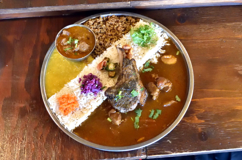 The calligraphic menu can be challenging to fully decipher, but basically they serve one main curry every day, veering towards experimental choices on weekends. In addition to the main curry there are helpings of keema and dal, colorful pickles lined up on the rice, and maybe a smidgen of fruit jam, plus whatever optional toppings and add-ons you've ordered.