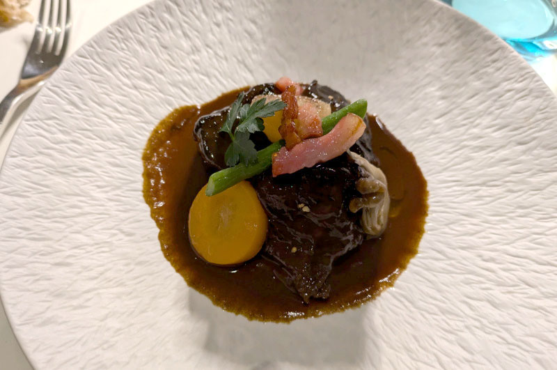 The menu is traditional French rather than anything Japanese-influenced, and it features luxurious main dishes like Lobster Thermidor, Beef Bourguignon and Tournedos Rossini beef with foie gras. Starters include a beautifully constructed Pate en Crout Alexandre Dumaine, based on a 400-year-old recipe.
