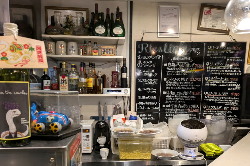 German wine bar Riesling offers very affordable wines and good, solid German food. The wine list features eighteen wines by the bottle, most of them in the Y4,500-6,000 range, and seven or eight by the glass. Erdinger weissbier is their draft beer.