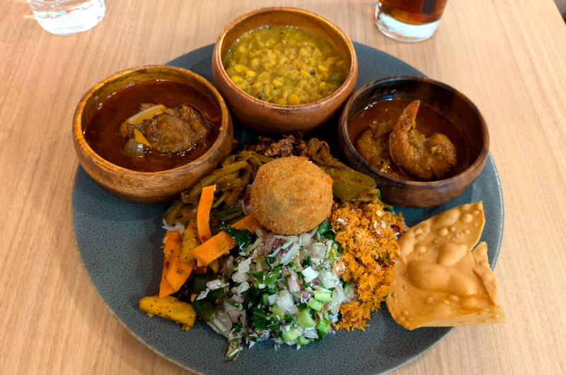 You can order chicken curry or the daily special as part of a combo plate, along with dal, basmati rice and a spread of six side items to mix with the rice. They also serve chicken biryani in limited quantities, and there's a selection of Sri Lankan snacks and desserts at dinnertime.