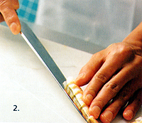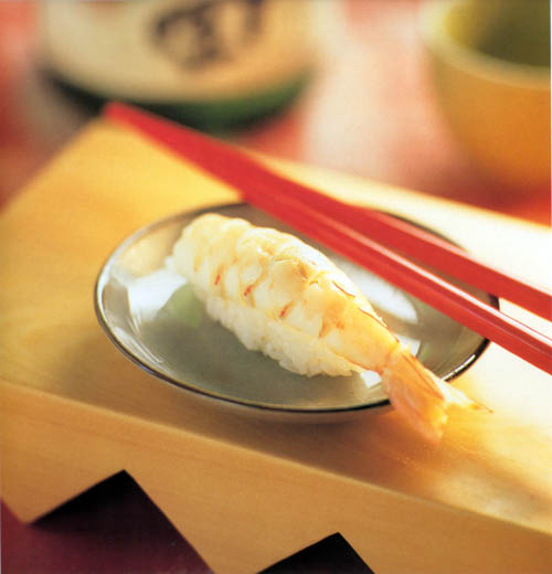 1. Wash shrimp under running water and cut off heads. Insert a bamboo skewer or long toothpick along shrimp from head to tail, running along legs of shrimp without touching flesh. Drop shrimp into a pot of salted, boiling water (use enough salt to make it taste like seawater). Boiling shrimp in salted water keeps protein in shrimp. They will sink to bottom and after 3 to 5 minutes will change color and rise to top. (Do not use a lid, or a strong smell of shrimp will remain.) To check that they are cooked, remove one shrimp from water and squeeze gently. If inside is firm, it is cooked. Quickly place shrimp in ice water. This gives them a good color and stops flesh from shrinking and becoming hard. When shrimp are cold, remove from ice water and place in a colander. To remove skewer, use a screwing motion to avoid breaking flesh. Remove shell from around body, but not tail. |