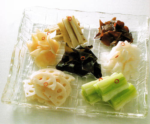 Some people use carrots or hanafu, a flower-shaped wheat gluten cake. Odd numbers are considered lucky in Japan, so seven types of pickles are presented here.