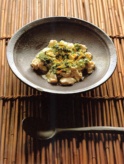 This is a kind of wafu (Japanese-style) pesto, except that it's spooned over fresh soft tofu, not pasta. This dish really wakes up the palate and the appetite, so it's good to serve it as the first course of a special meal.